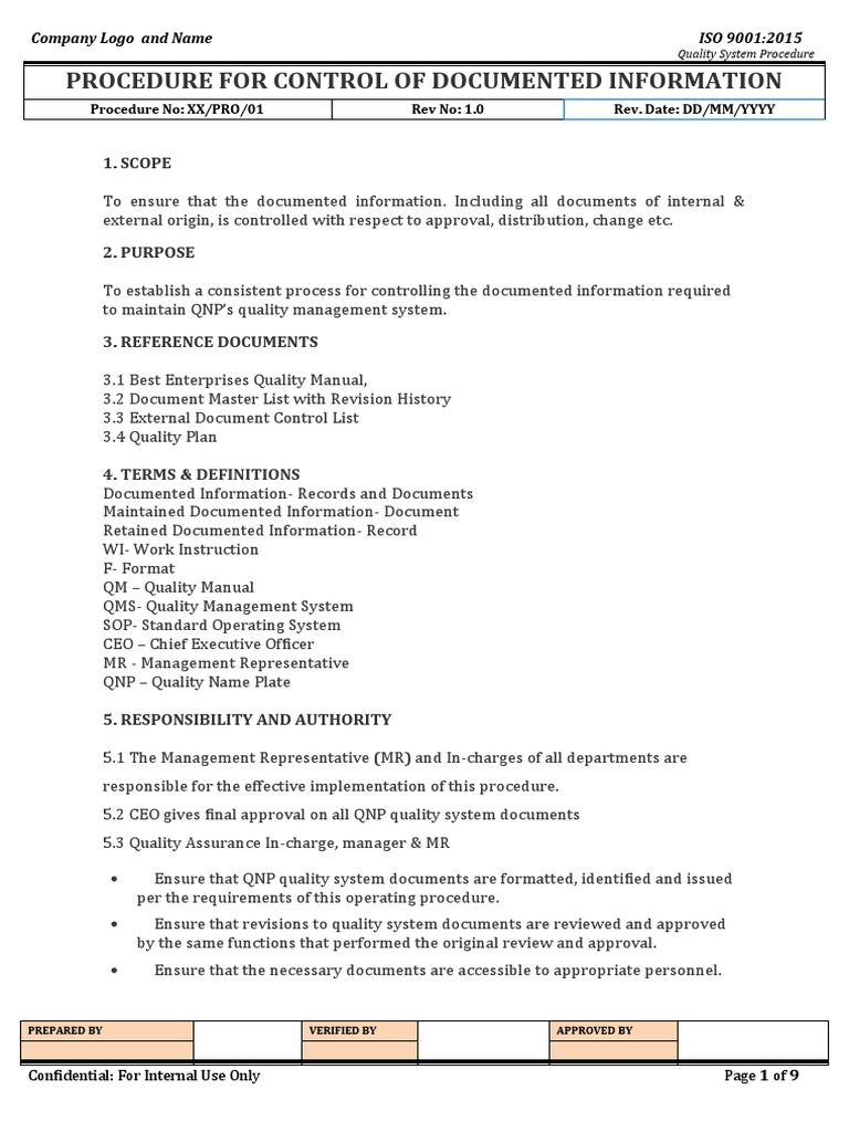 Iso 9001 document control procedure template