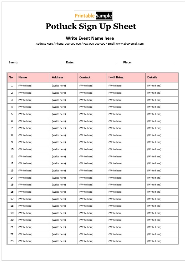 Potluck Sign Up Sheet Template 03 Printable Samples